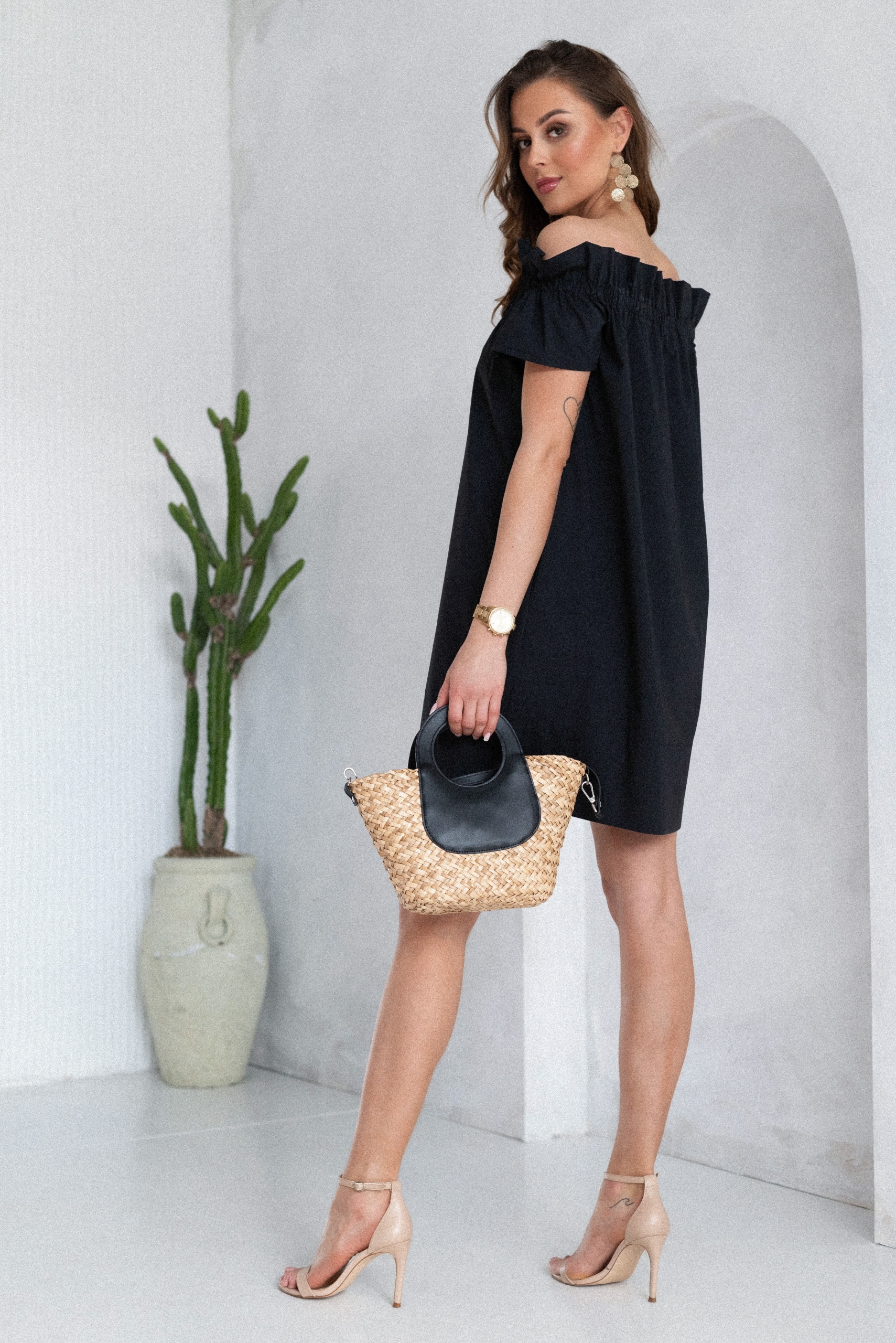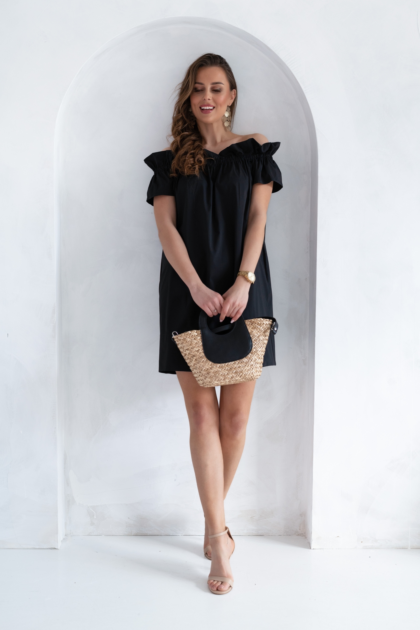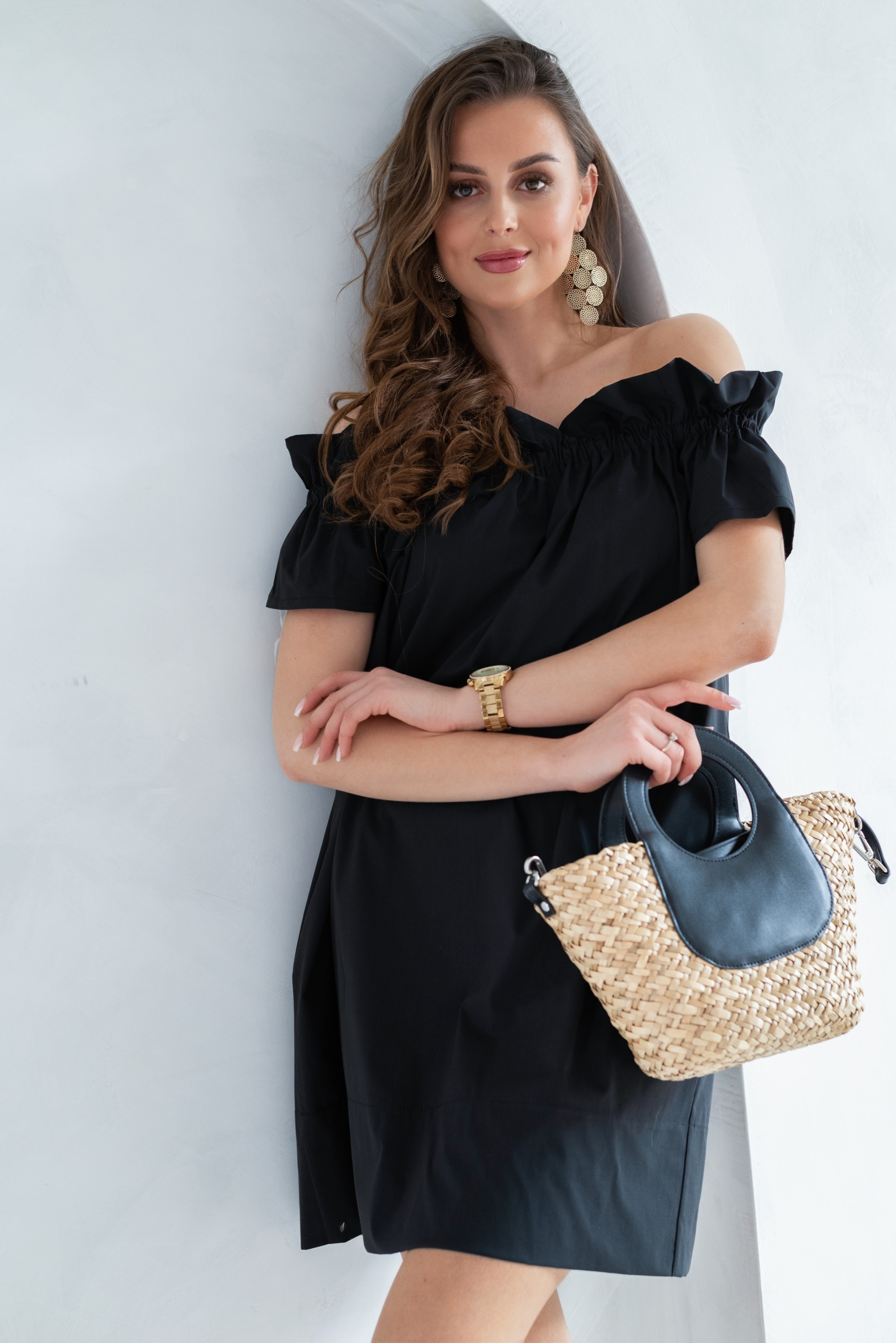 Bawełniana sukienka z kieszeniami. Dekolt a’la hiszpanka. Idealna na letnie wypady i gorące dni.