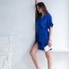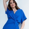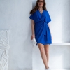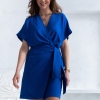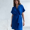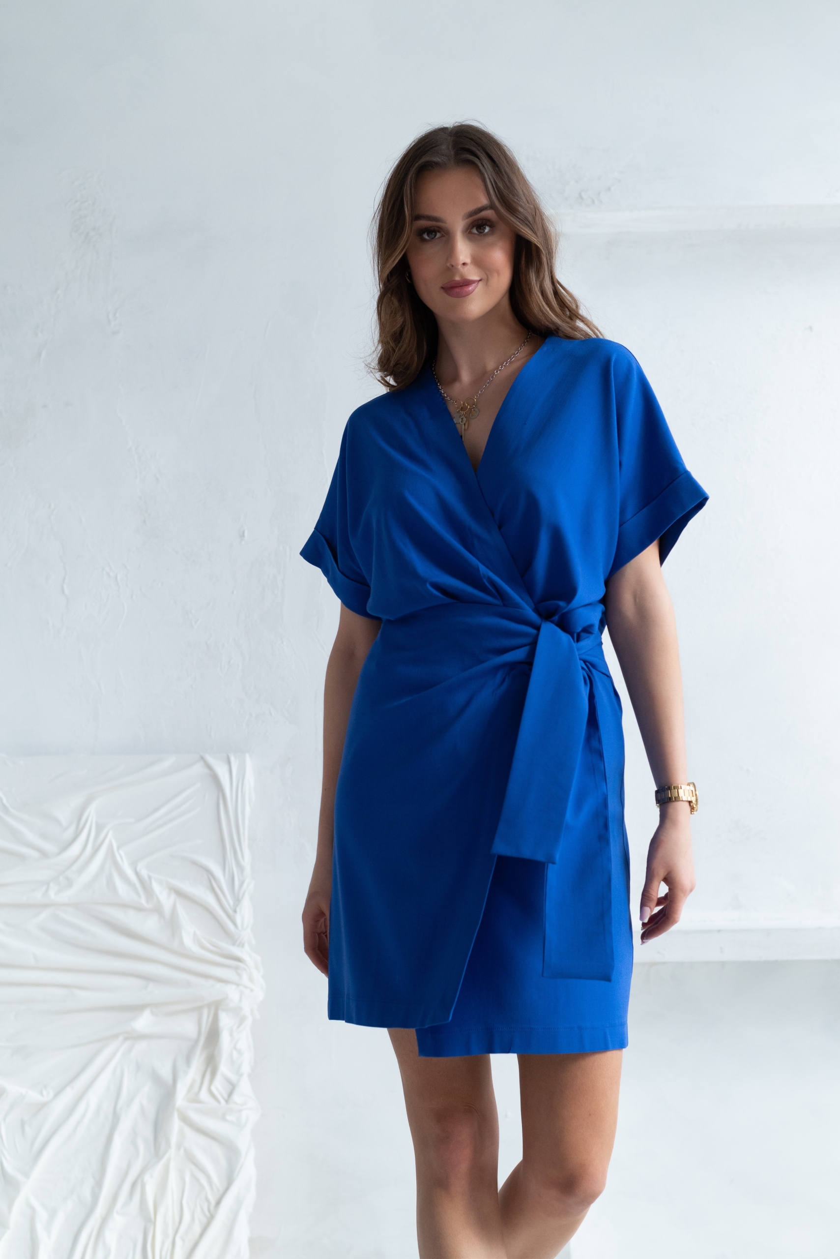 Wiskozowa sukienka o krótkim, kopertowym kroju. Wewnątrz zapinana na guziki i na zewnątrz wiązana. Dzięki temu można lepiej dopasować rozmiar. Rękaw krótki, w formie kimona.
