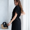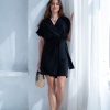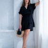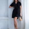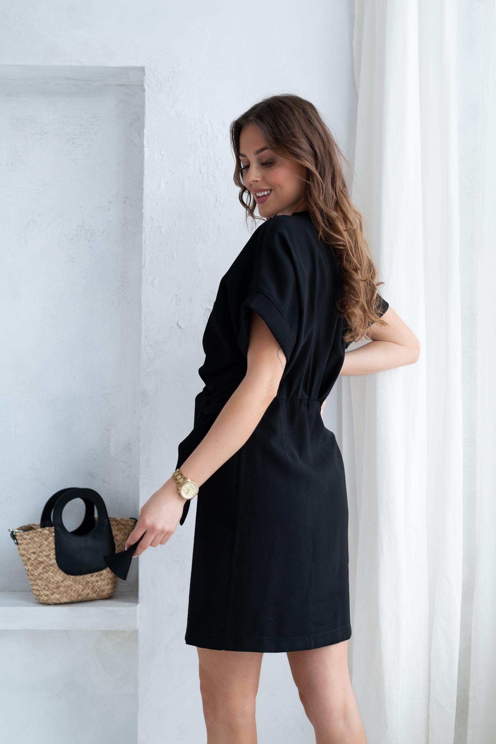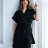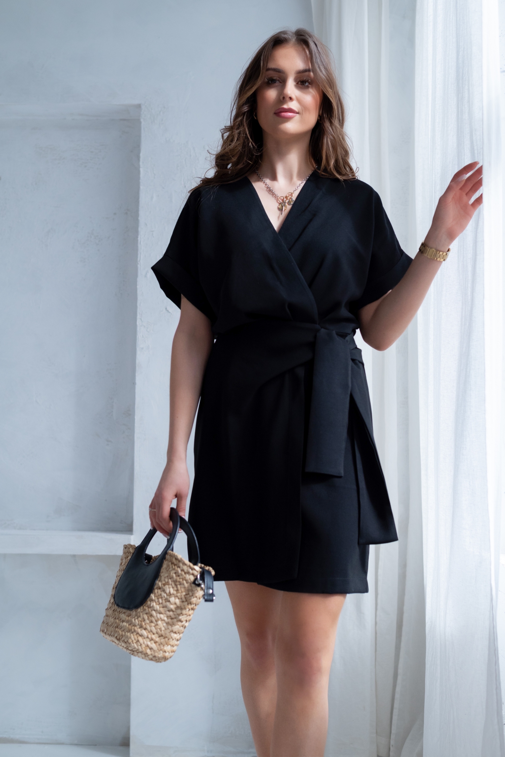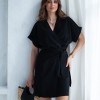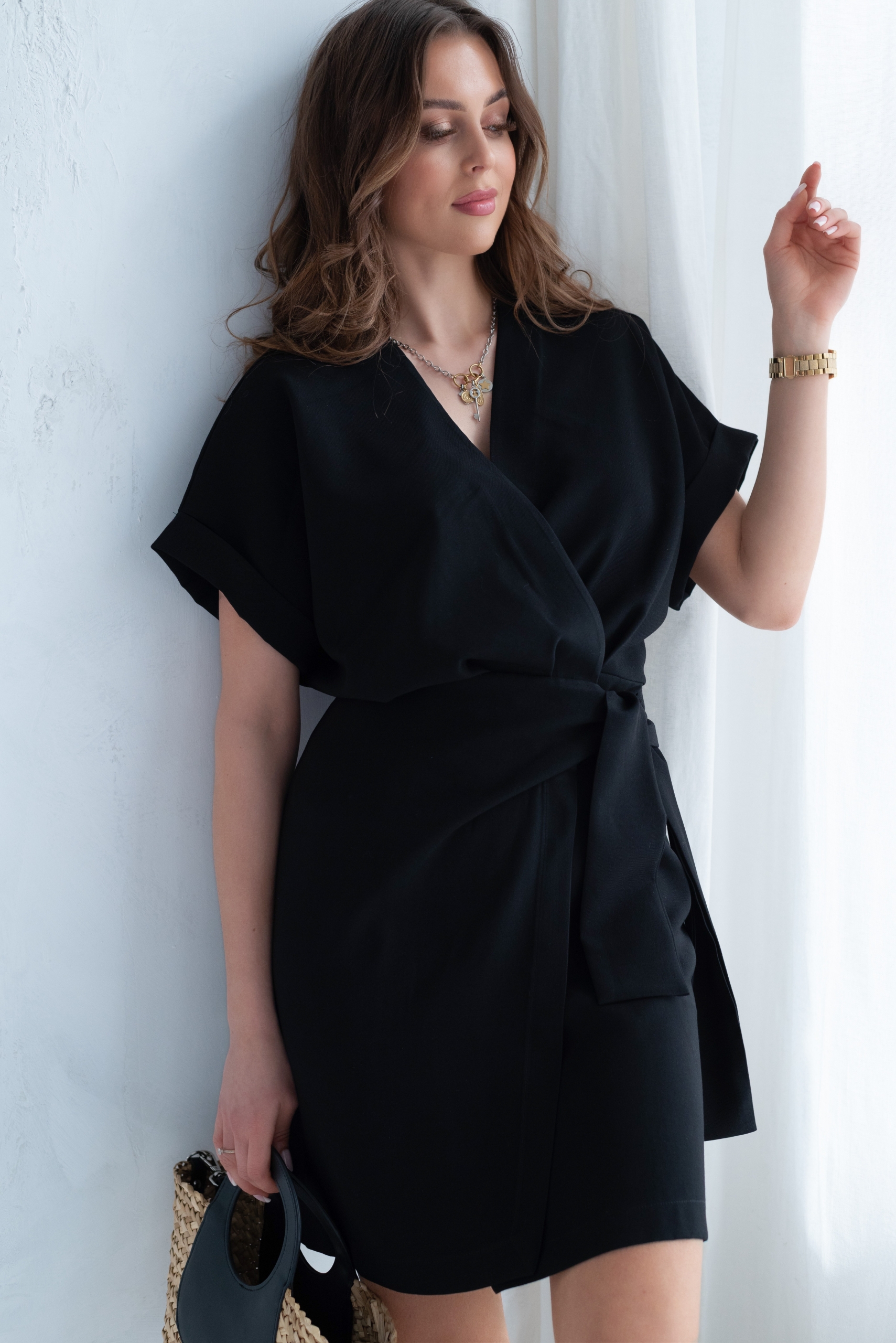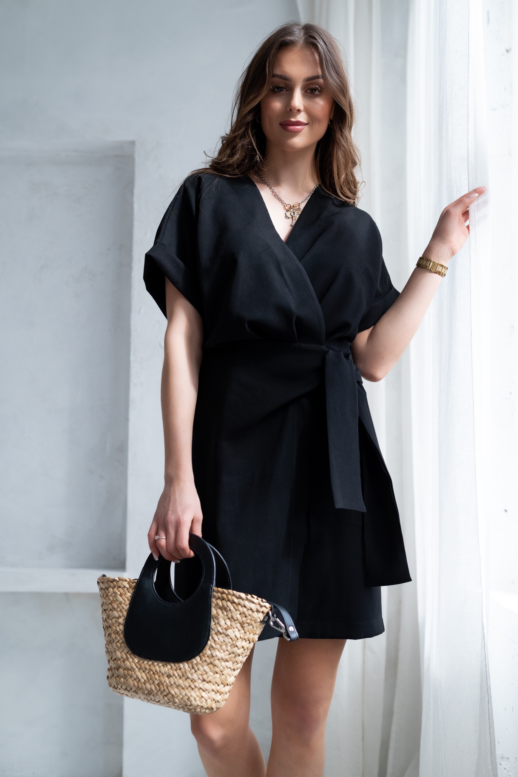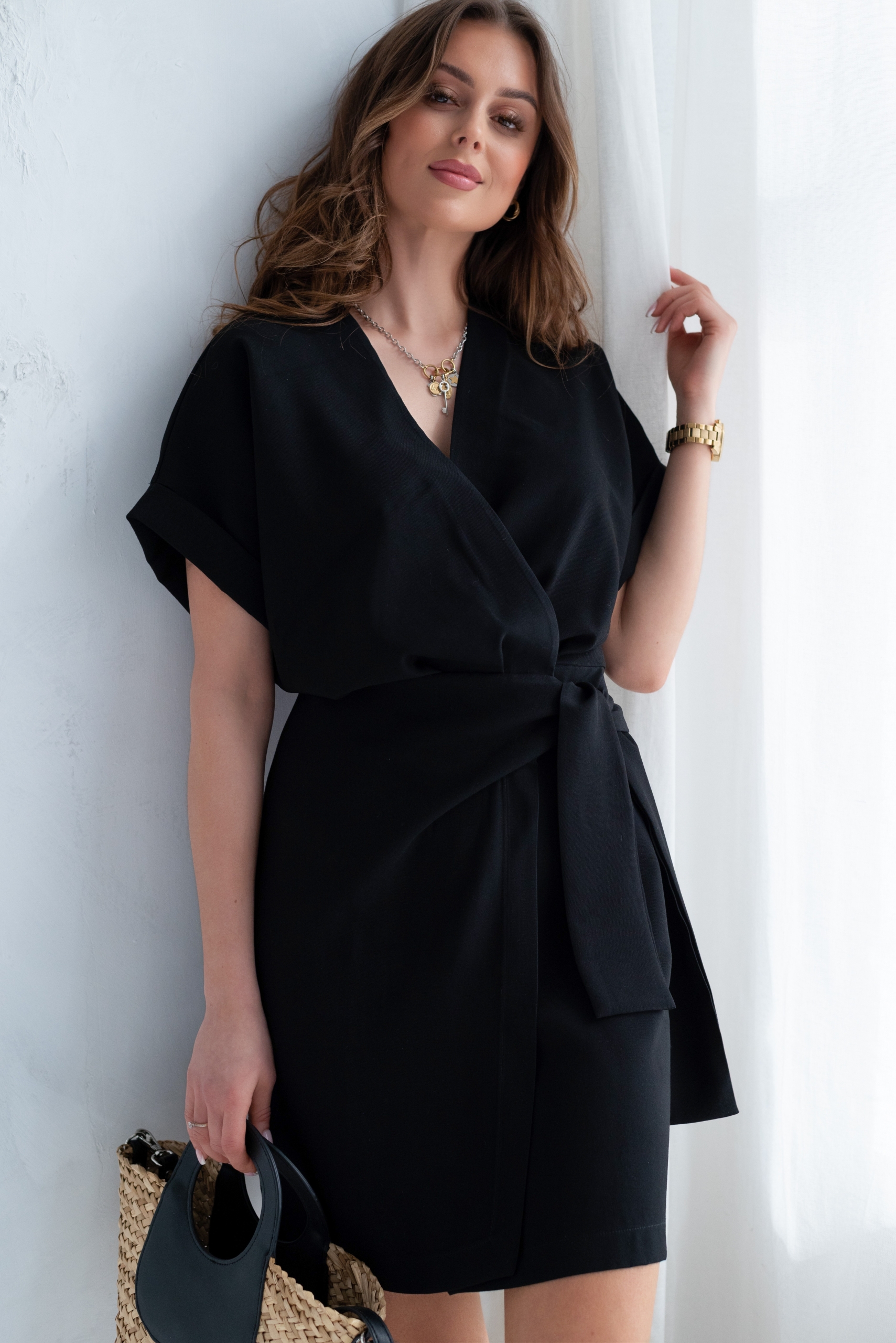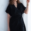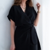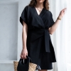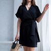 Wiskozowa sukienka o krótkim, kopertowym kroju. Wewnątrz zapinana na guziki i na zewnątrz wiązana. Dzięki temu można lepiej dopasować rozmiar. Rękaw krótki, w formie kimona.