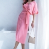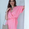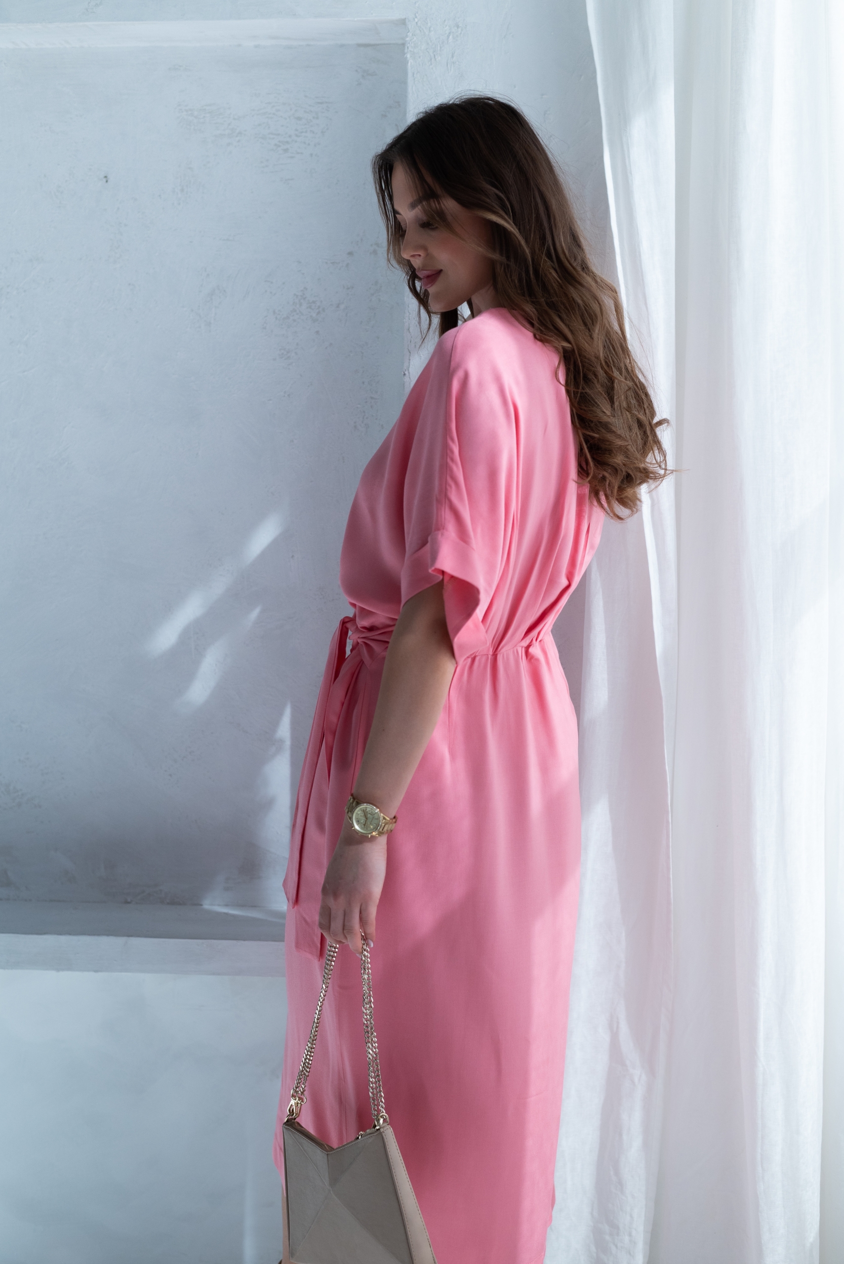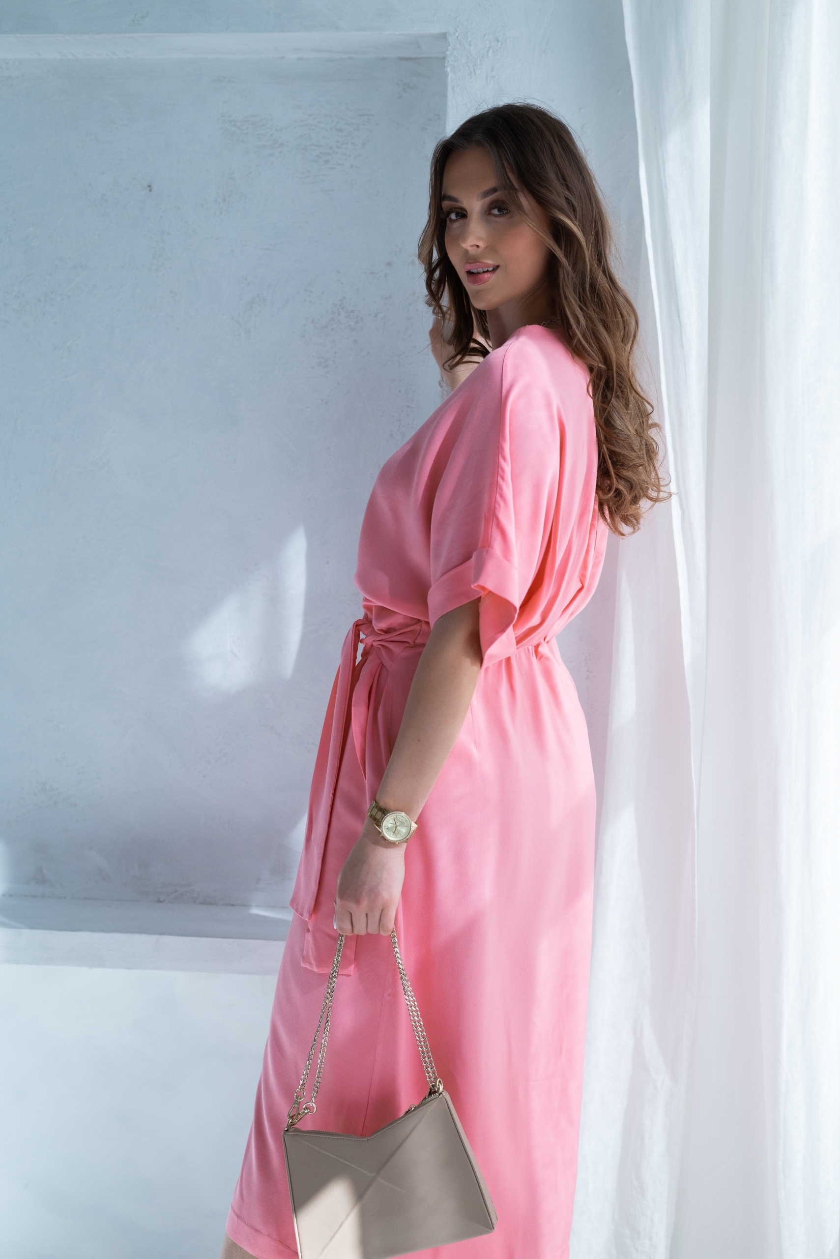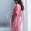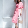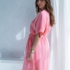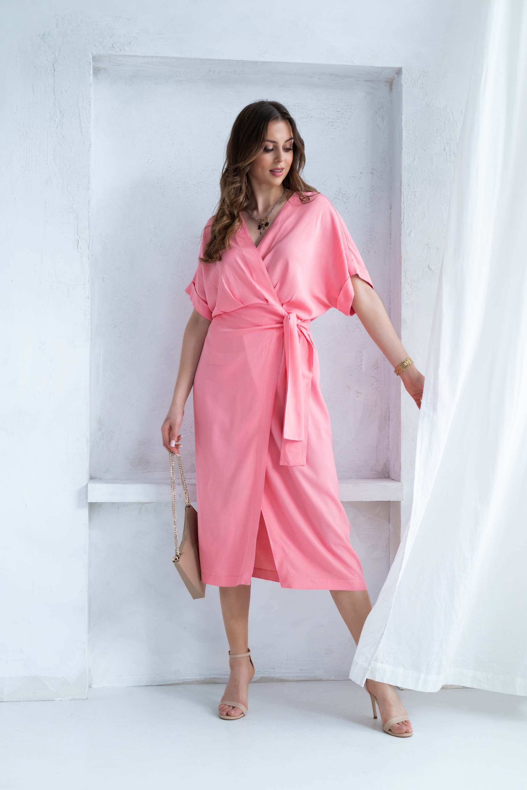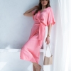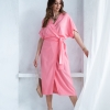 Wiskozowa sukienka o kopertowym kroju i długości midi. Wewnątrz zapinana na guziki i na zewnątrz wiązana. Dzięki temu można lepiej dopasować rozmiar. Rękaw krótki, w formie kimona.